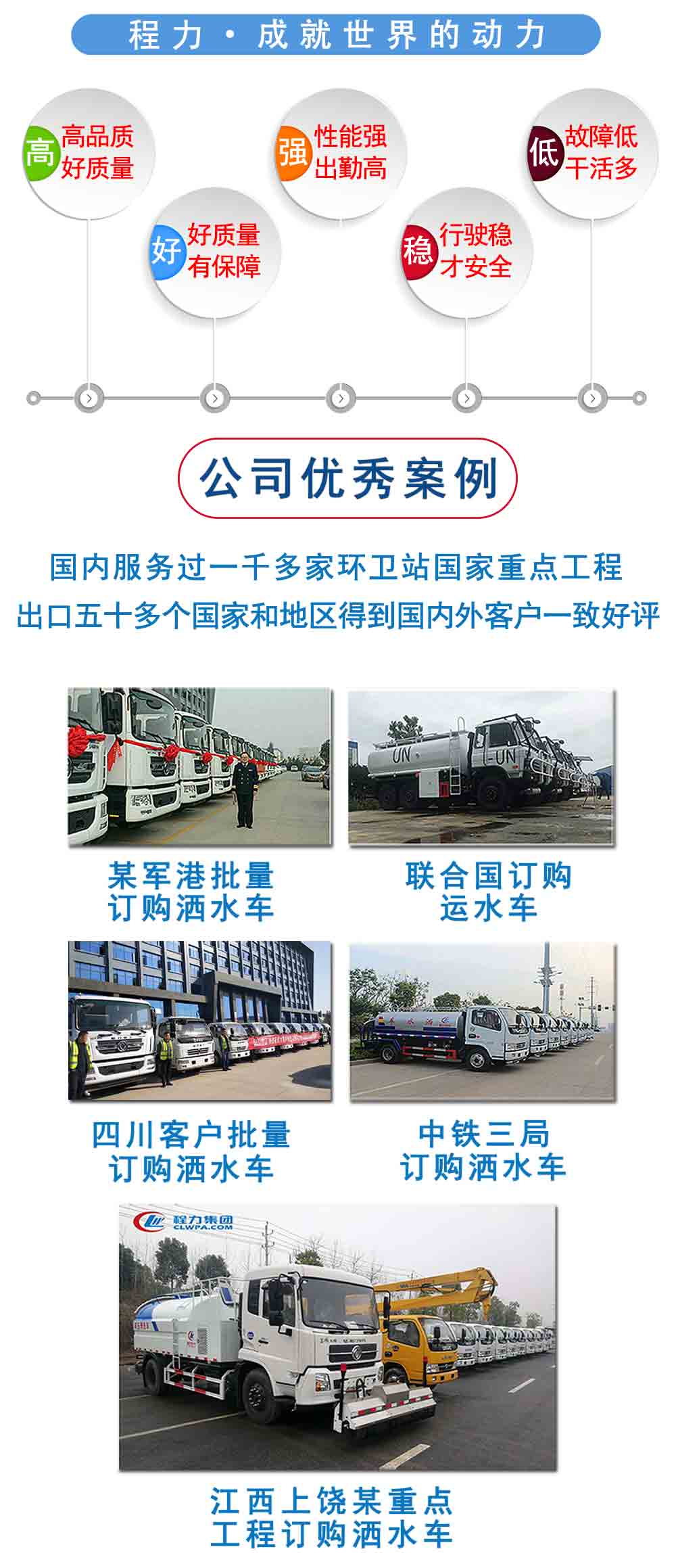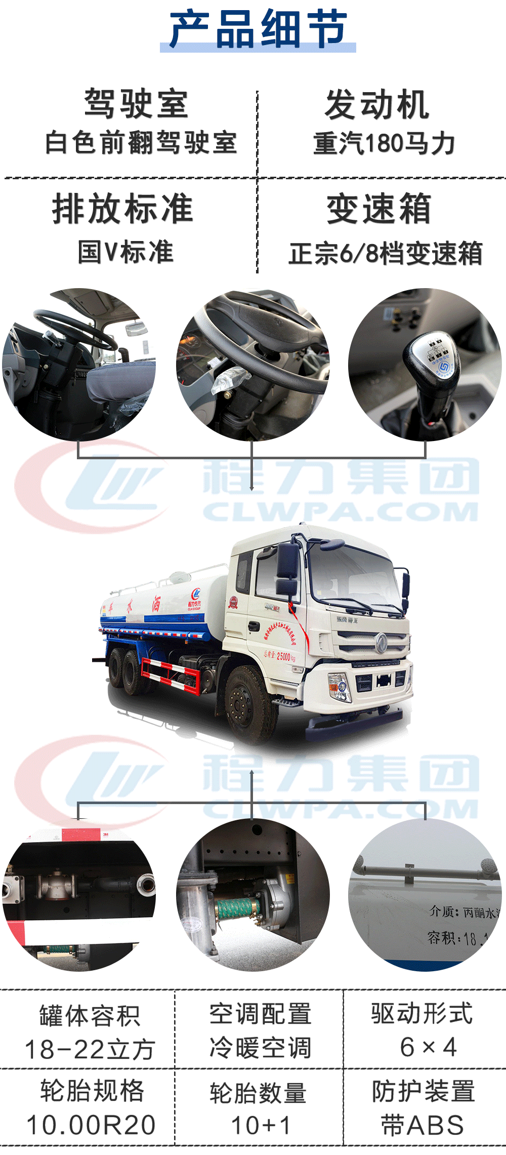| 其他 | 1、選裝不帶灑水平臺及選裝帶噴霧機組。 2、運輸介質:水,密度:1000千克/立方米,整車尺寸(長×寬×高)/前懸/后懸/罐體外形尺寸(長×長軸×短軸)/整備質量對應關系: a、帶灑水平臺時,罐體有效容積:14.93立方米,10100×2500×2950/1450/3000/6600×2300×1450/10580 b、不帶灑水平臺時,罐體有效容積:14.93立方米,10100×2500×2950/1450/3000/7200×2100×1450/10580 c、帶噴霧機組時,罐體有效容積:12.83立方 | ||