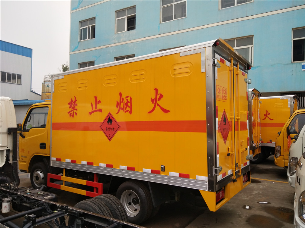 | 其他 | 该车适用于运输危险品。厢体顶部封闭,不可开启。该车用于运输独立容器包装的易燃气体:液化石油气,原油气,压缩天然气,乙炔,甲烷,乙烷,丙烷,丁烷,丙烯,丁烯,二甲醚,硫化氢,打火机或打火机加油器(装有易燃气体),压缩氢,类项号:2.1;运输具有独立容器包装的非易燃无毒气体:液化气体(非易燃,充有氮,二氧化碳或空气),压缩氧(氮,空气,氦,氩,氖),二氧化碳,类项号2.2。仅采用底盘子午线轮胎和带ABS的底盘,该车前轮安装盘式制动器,前置排气管,装配限速装置,限速80km/h。安装带有卫星定位功能的行驶记录仪 | ||