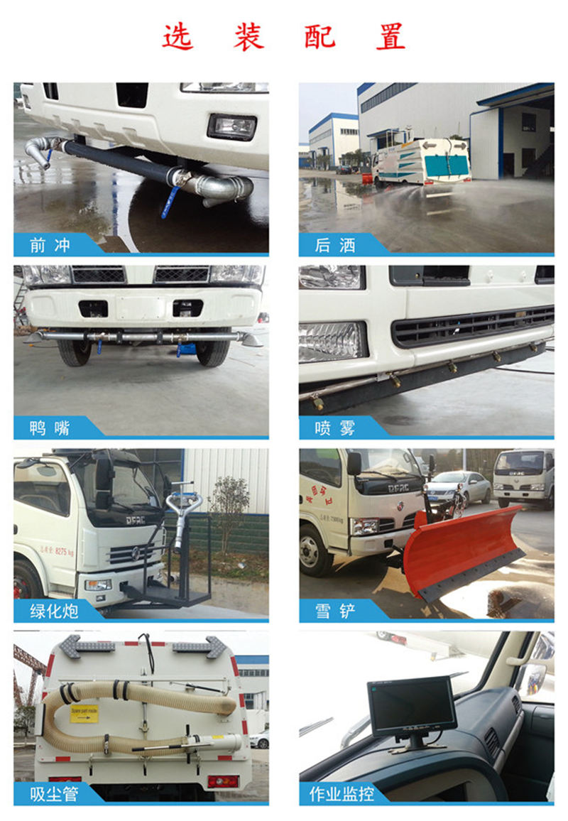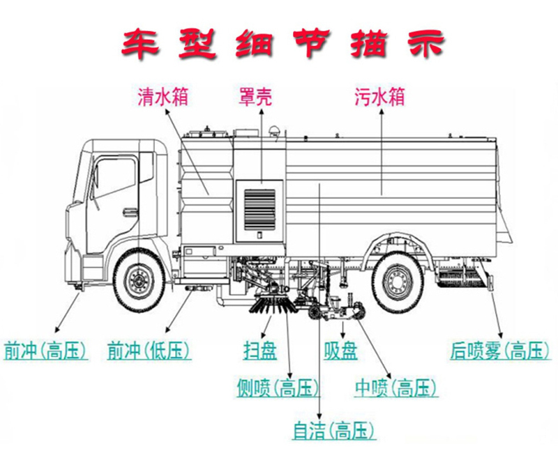 ?該掃路車采用東風(fēng)二類底盤改裝,加裝副發(fā)動(dòng)機(jī)、風(fēng)機(jī)、清水箱、垃圾箱、左右立掃、后置吸盤,掃盤降塵系統(tǒng),液壓系統(tǒng)、專用裝置電控系統(tǒng)和副車架等改裝而成。