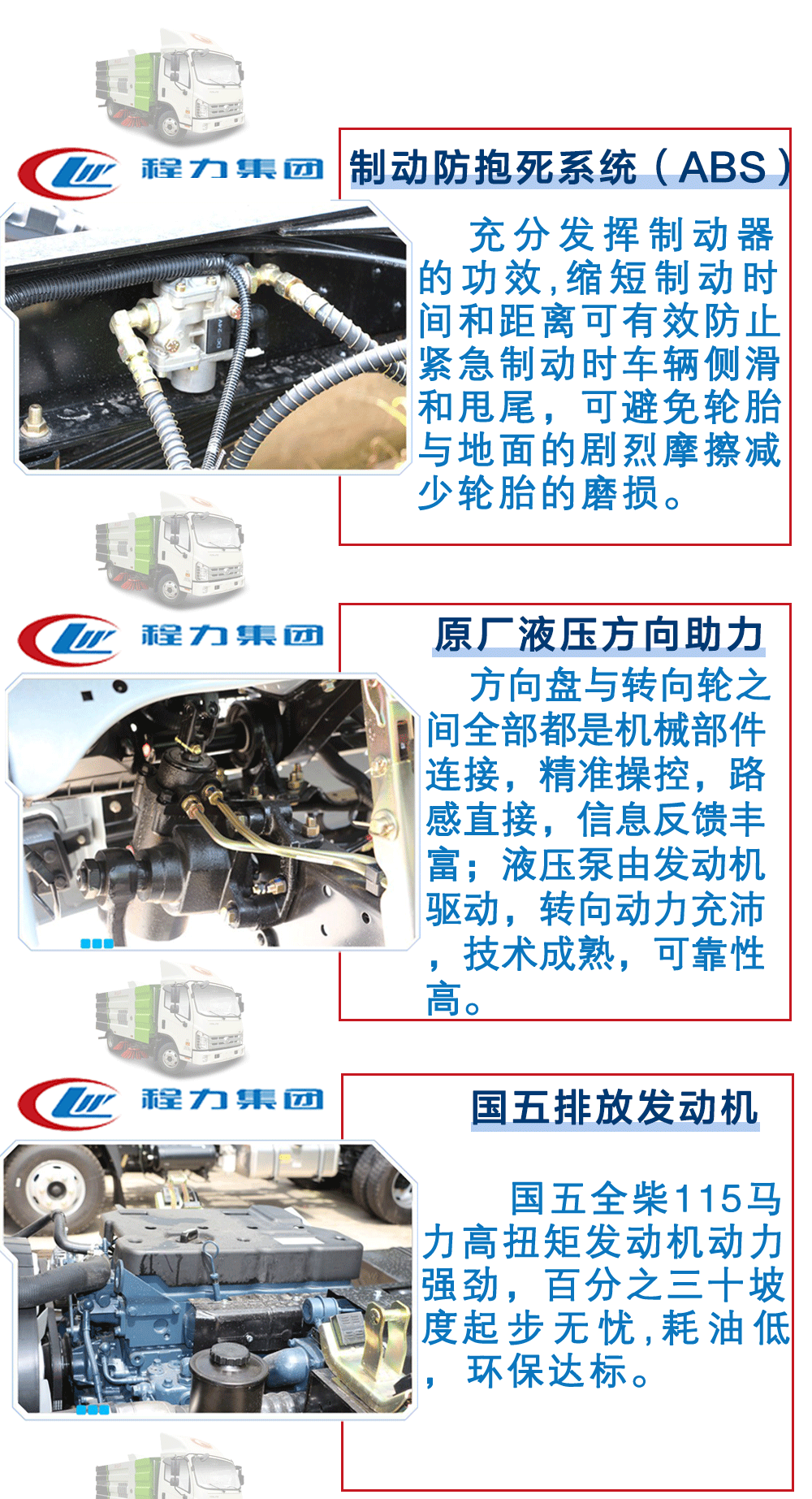 | 其他 | 隨底盤選裝駕駛室,選裝箱體外觀。車輛兩側為專用作業裝置,后防護采用冷彎型鋼/Q235-A,焊接連接。后防護截面高度尺寸120mm, 截面寬度尺寸50mm,下邊緣離地高度400mm。ABS系統控制方式4S/4M,ABS系統控制器型號:CM4XL-4S/4K(4S/4M),ABS系統控制器生產廠家:廣州科密汽車電子控制技術股份有限公司。 | ||
