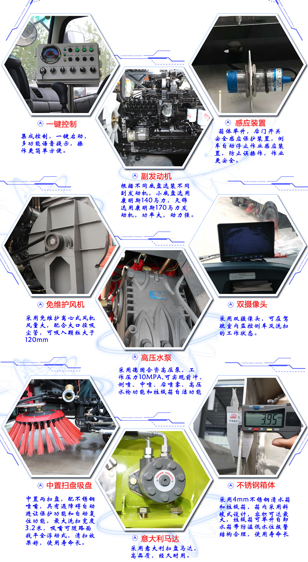 | 其他 | 選裝吸盤中置和雙掃刷及無掃刷結(jié)構(gòu),選裝后部結(jié)構(gòu);選裝弧形垃圾箱;側(cè)面防護(hù)裝置與工作裝置相干涉,故豁免;后下部防護(hù)裝置材料材質(zhì):Q235,連接方式:焊接加螺栓連接,斷面尺寸(寬×高):50×100(mm),離地高度:410mm;ABS及其控制器型號(hào)為:APG3550500A4,生產(chǎn)廠家為:浙江亞太機(jī)電股份有限公司. | ||