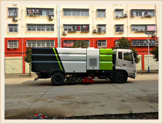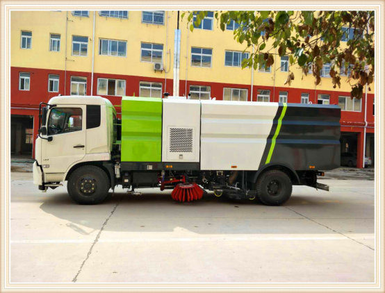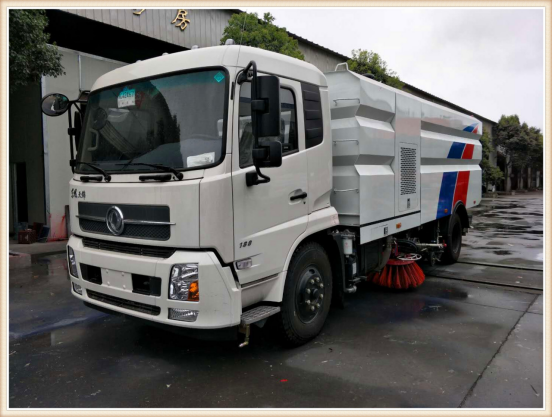 Ø 洗掃車采用東風天錦DFL1160BX1V型國Ⅴ二類汽車底盤改裝,加裝副發動機、風機、高壓水泵、清水箱、垃圾箱、左右立掃、帶噴水桿的寬吸嘴、低壓沖洗系統、掃盤降塵系統、液壓系統、專用裝置電控系統和副車架等改裝而成。