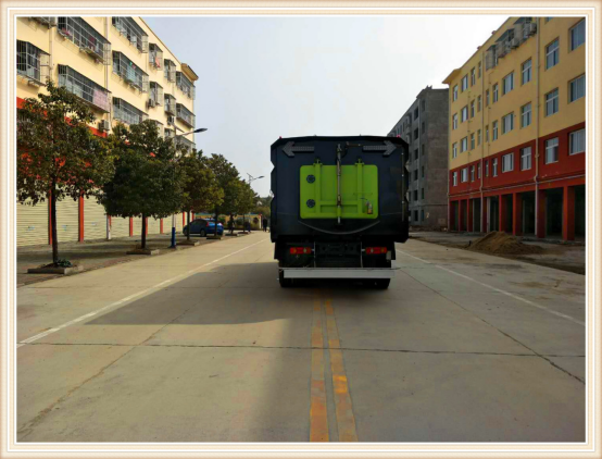 Ø 清水箱充分利用了車載空間,容積大,容積達9m3。垃圾箱采用單層304不銹鋼結構,傾翻卸料,帶高壓自潔裝置。自潔裝置可在垃圾箱卸料時幫助卸料,清洗垃圾箱內部。