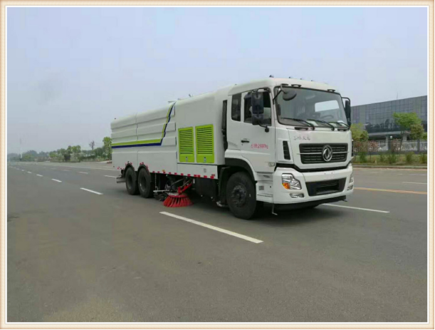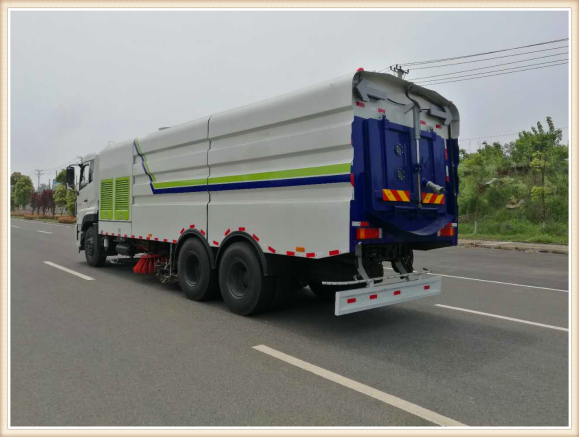 洗掃車采用東風天龍DFL1250A13型國Ⅳ二類汽車底盤改裝,加裝副發動機、風機、高壓水泵、清水箱、垃圾箱、左右立掃、帶噴水桿的寬吸嘴、低壓沖洗系統、掃盤降塵系統、液壓系統、專用裝置電控系統和副車架等改裝而成。副發動機驅動風機和高壓水泵,副發動機采用東風康明期6缸柴油發動機。風機用8.0高壓離心風機,效率高、風量大,最高風量達23500m3/h。高壓水泵采用同際知名T7012IR 型柱塞柱,流量合適,壓力高,允許最高壓力達10MPa,清水箱充分利用了車載空間,容積大,容積達12m3。垃圾箱采用單層不銹鋼結構,傾翻卸料,帶高壓位自潔裝置。自潔裝置可在垃圾箱卸料時幫助卸料,清洗垃圾箱內部。左右立掃為單掃盤,減少了掃刷數量和掃刷消耗量,能降低使用成本。左右立掃分開控制,可實現左掃、右掃和全掃等不同作業模式。寬吸嘴的吸口寬度達到2418mm,確保作業總寬度大于3.5mm。4個高度可調的吸嘴輪,能方面調整和保證吸嘴與路面間的合理間隙。吸嘴內高有噴水桿,盡可能多地將高壓洗滌噴嘴布置在吸嘴內部,不但清洗效果好,還能最大限度減少高壓水氣流沖起污物產生的二次污染。左右噴水桿安裝在吸嘴上,隨吸嘴升降,結構簡單緊湊,保證噴水桿的離地高度固定不變,達到最佳清洗效果。開式液壓系統驅動左右立掃升降、左右掃肋旋轉、吸嘴升降、垃圾箱后門開閉、垃圾箱傾翻復位等機械動作。底盤變速箱側取力器驅動低壓水泵,實現灑水車的低壓沖洗功能。一鍵式作業起動和停機操作。