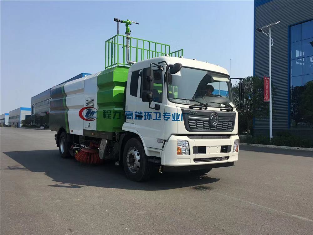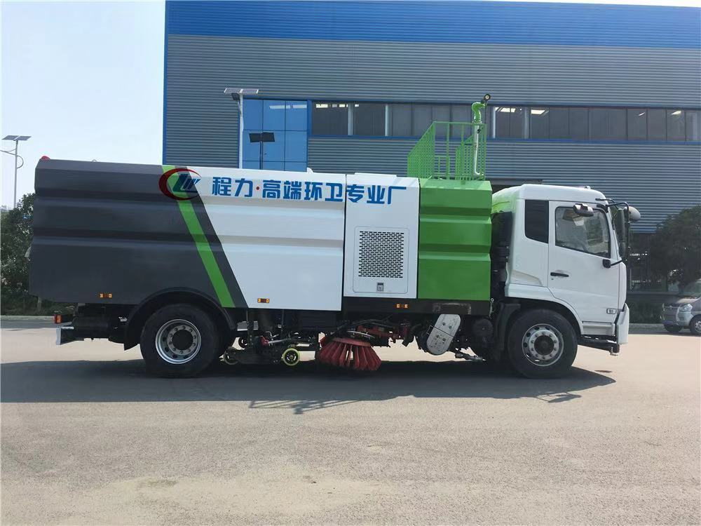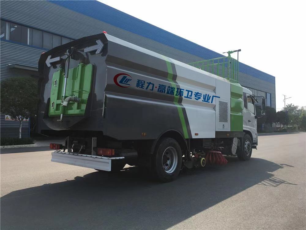 該洗掃車采用東風天錦二類底盤改裝,加裝副發動機、風機、清水箱、垃圾箱、左右立掃、掃盤降塵系統、左右高壓側噴高、吸盤內置高壓主噴桿、氣動系統、液壓系統、專用裝置電控系統和副車架等改裝而成。