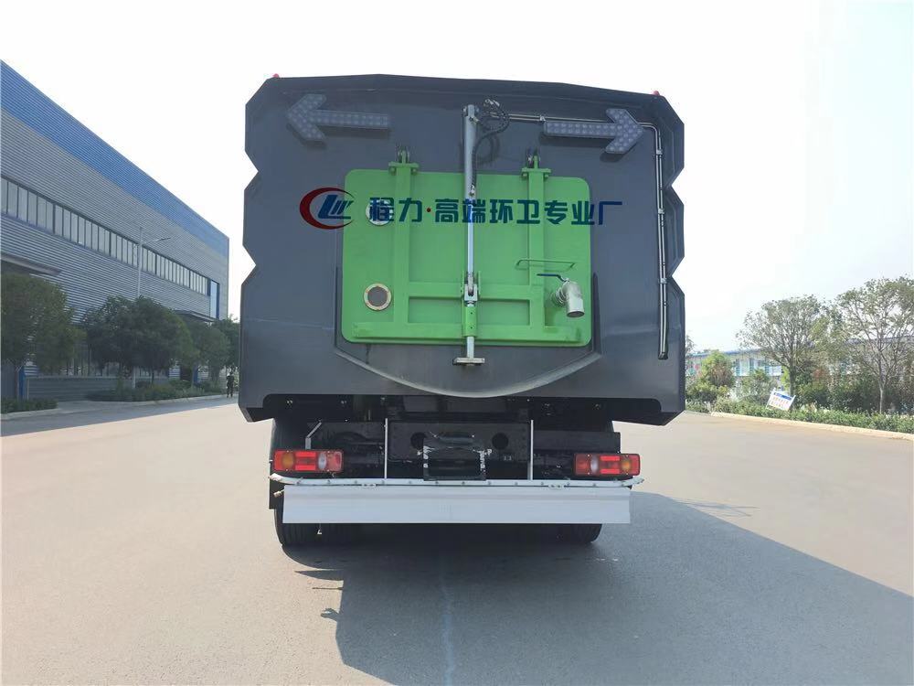 ●清水箱和垃圾箱分體布置,有效空間利用最大化,一次連續作業時間長。同時在作業過程中可通過污水排放裝置對污水進行排放,隨時加清水繼續作業;垃圾箱采用雙油缸自卸卸料,箱內同時設有大流量高壓噴嘴,可快速沖洗垃圾箱