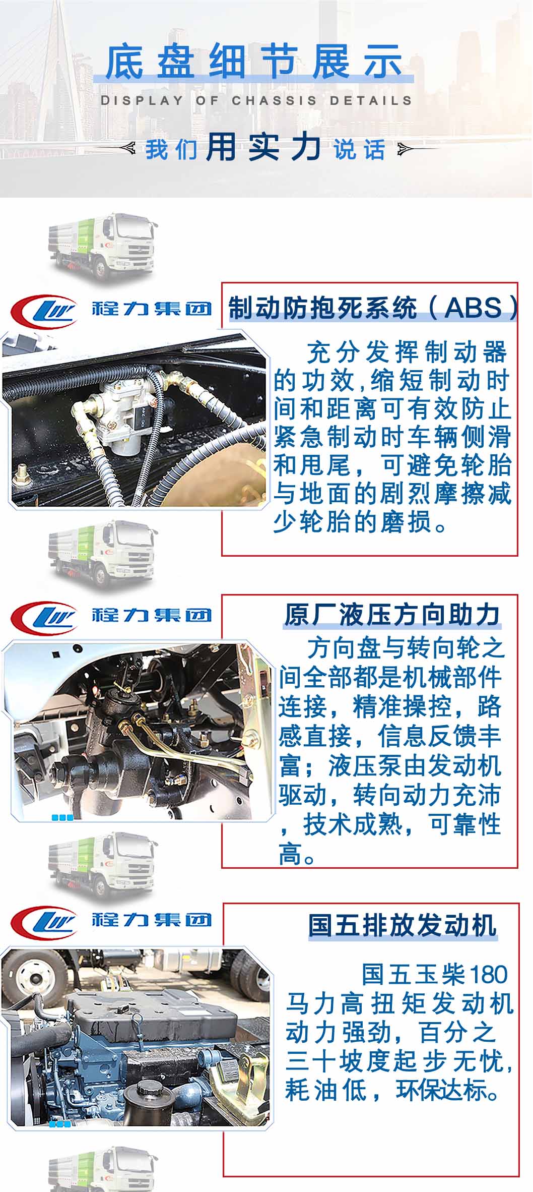 | 其他 | 隨底盤選裝駕駛室,選裝吸盤中置和雙掃刷及無掃刷結構,選裝后部結構;選裝弧形垃圾箱。側防護由專用裝置代替。后防護采用冷彎鋼/Q235-A,焊接連接。后防護截面高度尺寸240mm, 截面寬度尺寸60mm,下邊緣離地高度400mm。ABS型號/企業: ABS-E 4S/4M/威伯科汽車控制系統有限公司。 | ||