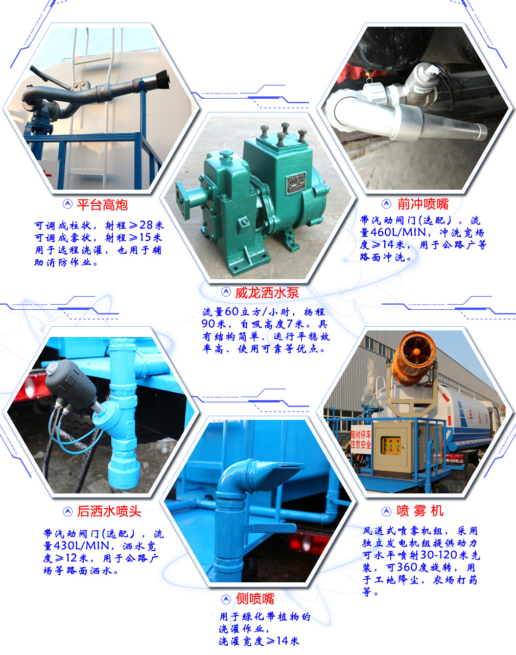 | 其他 | 1、運輸介質為:抑塵劑,密度:780千克/立方米.罐體有效容積9.90立方米;整車長度(mm)、罐體外形尺寸(長×長軸×短軸)(mm)與軸距(mm)的對應關系:8500/4000×2300×1500/4500, 8700/4200×2250×1450/4700,9000/4500×2200×1400/5000;2、防護材料:Q235碳鋼,連接方式:左右側面及后下部防護均采用焊接連接,后部防護斷面尺寸(mm):150×50,后部防護離地高度(mm):530。3、ABS型號:3631010-C2000,4460046440;生產廠家:東科克諾爾商用車制動系統(tǒng)(十堰)有限公司,威伯科汽車控制系統(tǒng)(中國)有限公司。4、車輛顏色、文字噴涂及局部細節(jié)可變化;5、隨底盤選裝駕駛室。專用裝置:抑塵霧炮, 型號:LM-40 廠家:湖北龍馬汽車裝備有限公司。 | ||